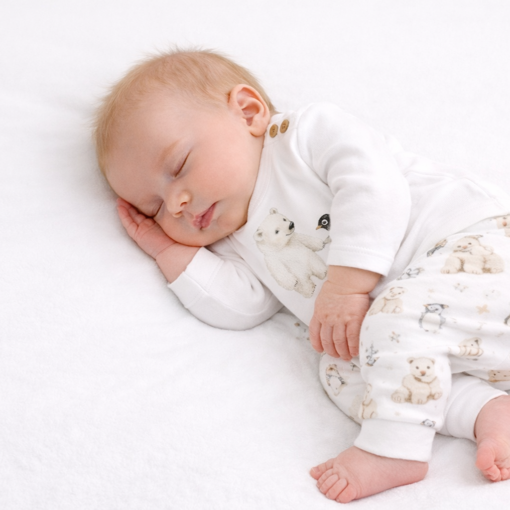 Made from GOTS certified organic cotton, this long sleeve tee comes with hand illustrated central print of a polar bear and penguin and has buttons to should for changing ease. 100% Certified organic cotton #USB008294. Made in India. Wash according to care instructions.