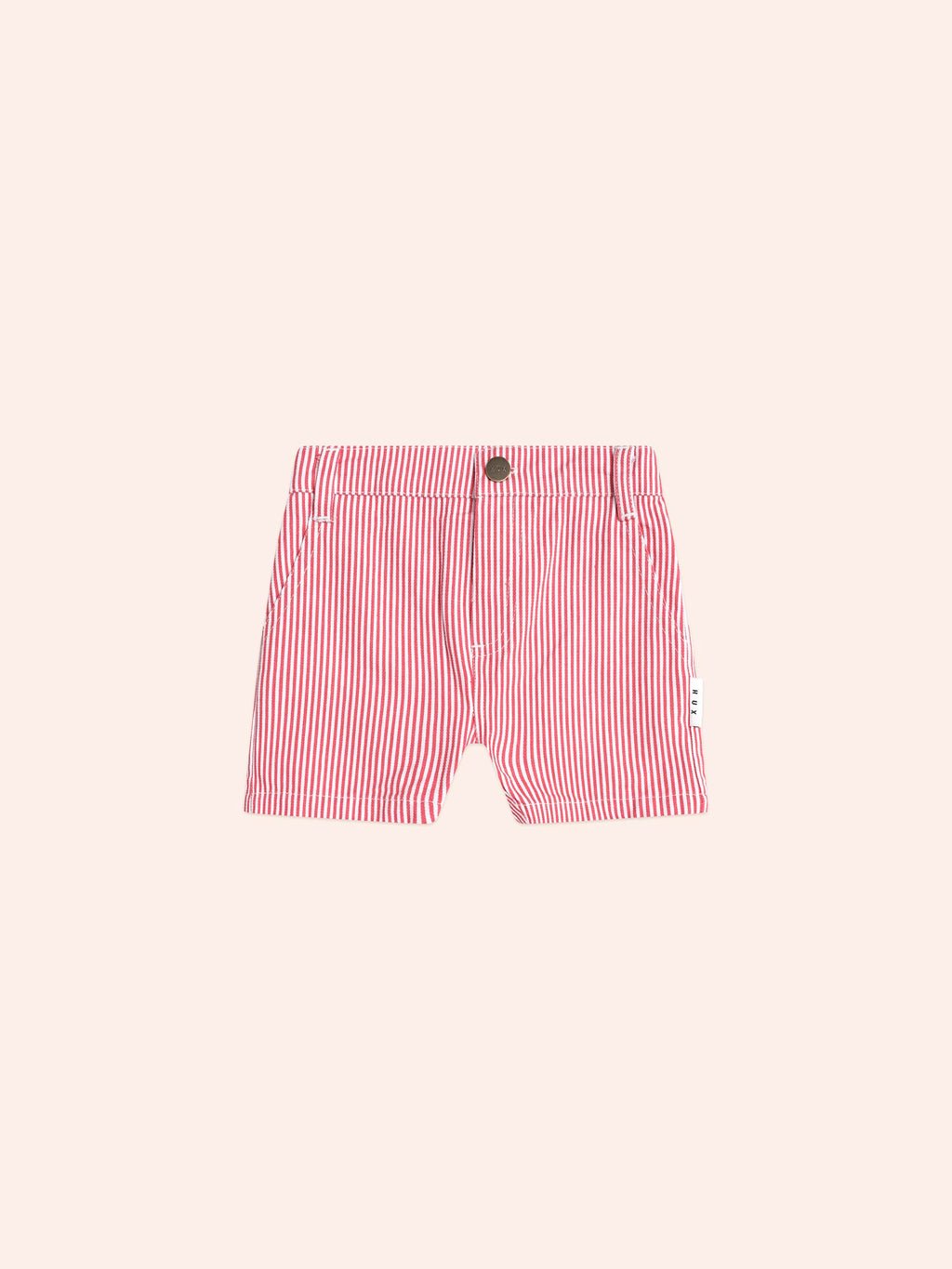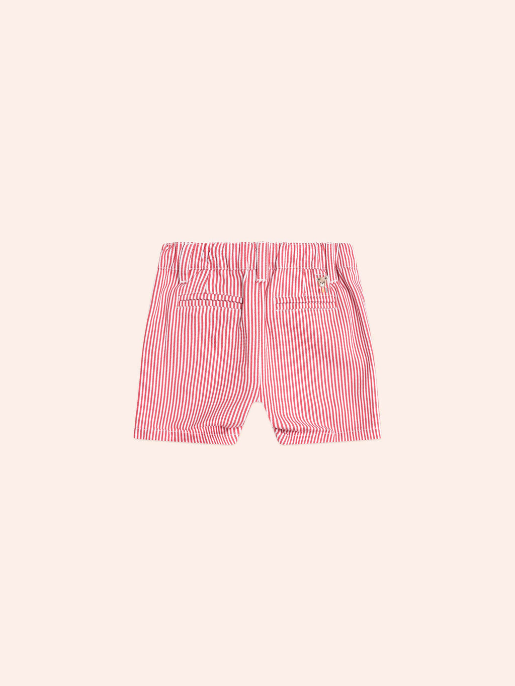 The perfect red pinstripe chino short for warm weather festive occasions. Dress them up or down. Made from a soft cotton twill, they feature a peeping Huxbear embroidery on the back and an internal button waistband and belt loops for adjustable waist. Zipper fly on sizes 4 and up.
