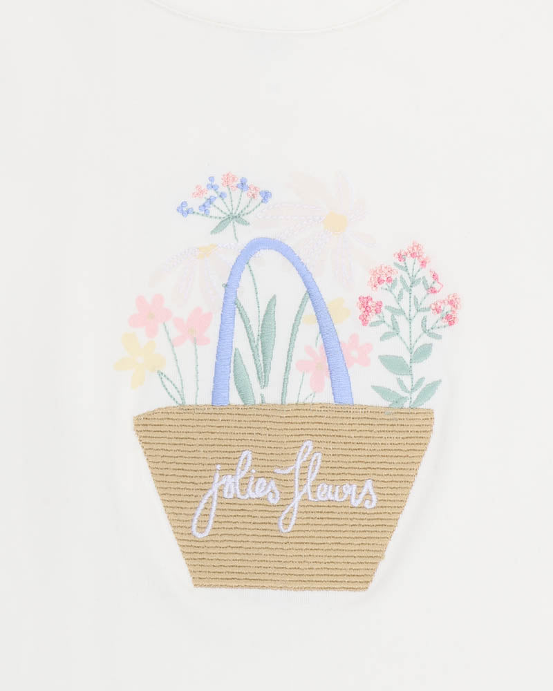 Brighten up your young one's day with our charming floral tee, perfect for sunny adventures and everyday play. Crafted from a soft and stretchy organic cotton blend, this tee features a sweet embroidered flower basket with "jolies fleurs" text and delicate frill sleeves for a pretty finish. This tee pairs perfectly with the Bonnie check shorts or the Bonnie embroidered shorts for a Summery outfit.