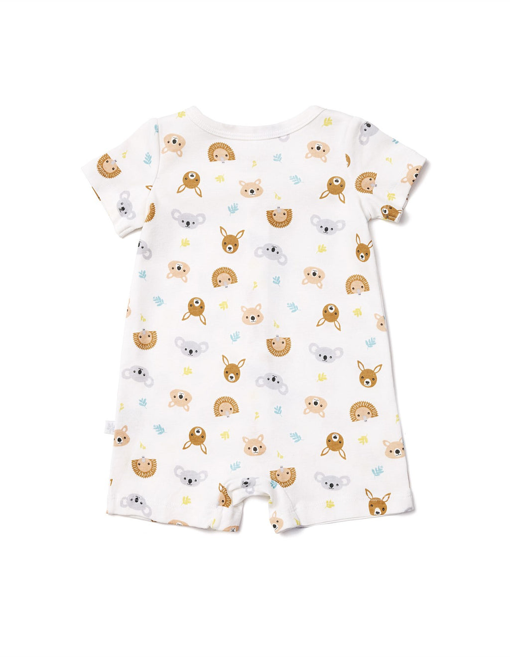 Dress your baby in Australian charm with this short sleeve romper featuring an all-over Australiana print - complete with koalas, wombat, kangaroos, and echidnas. Made from 100% soft cotton, it’s breathable, gentle on skin, and perfect for warm days. The front press studs make dressing and changes a breeze, combining comfort with everyday convenience.