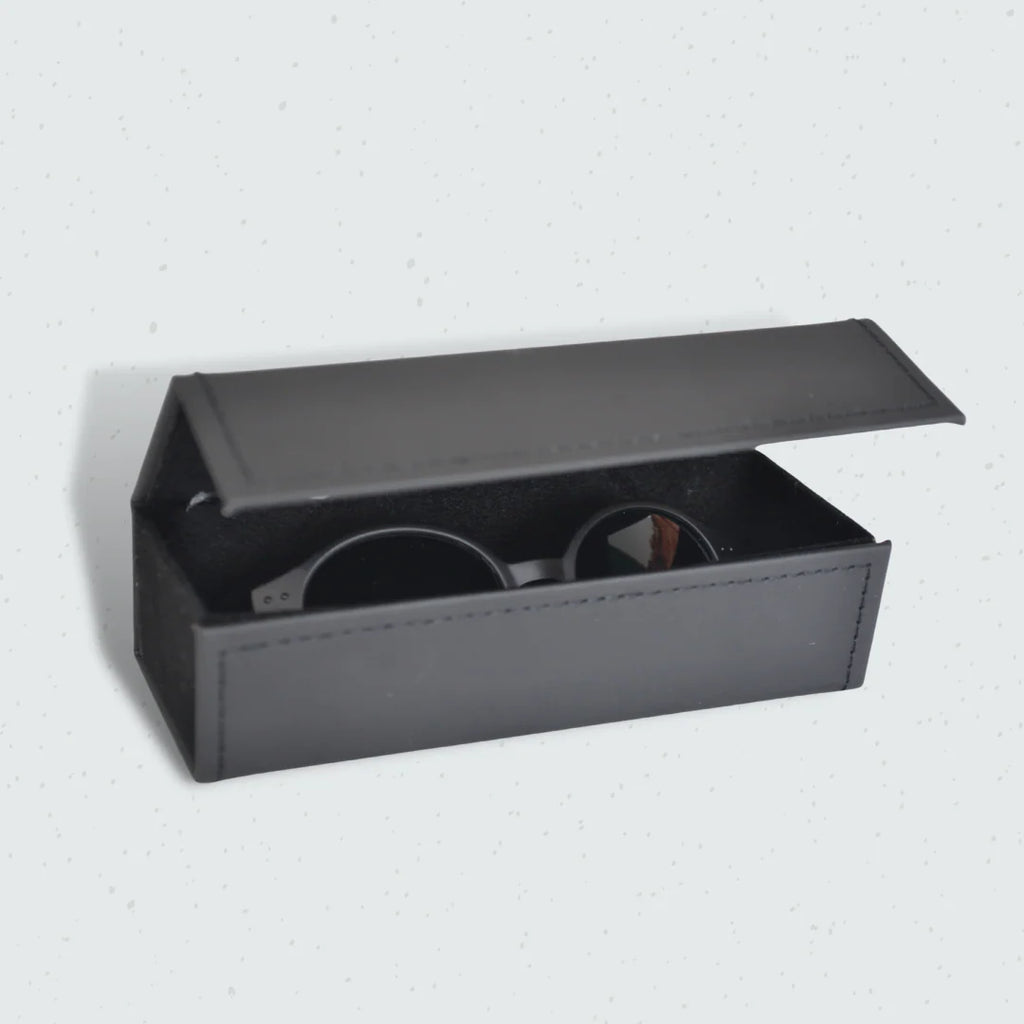 Leather-look, velvet lined travel case with microfibre buffing cloth included
