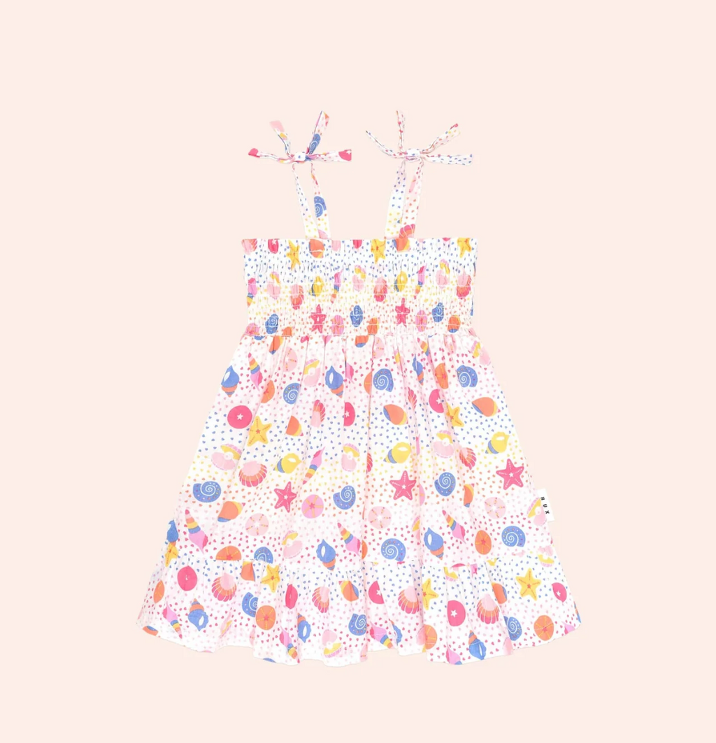 Sun, sand, and seashells—this dress brings it all together. With its sweet shoulder ties and seaside-inspired print, it’s the ultimate summer piece for beach adventures, backyard play, and everything in between.
