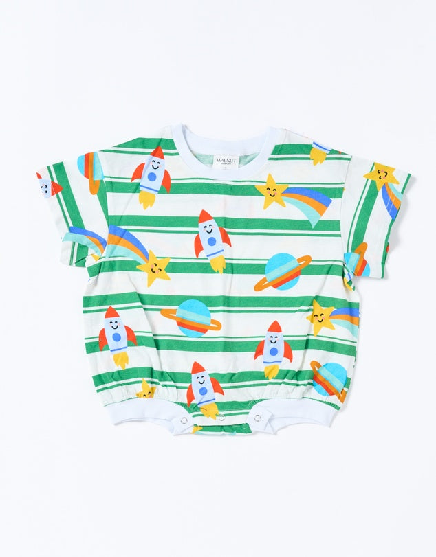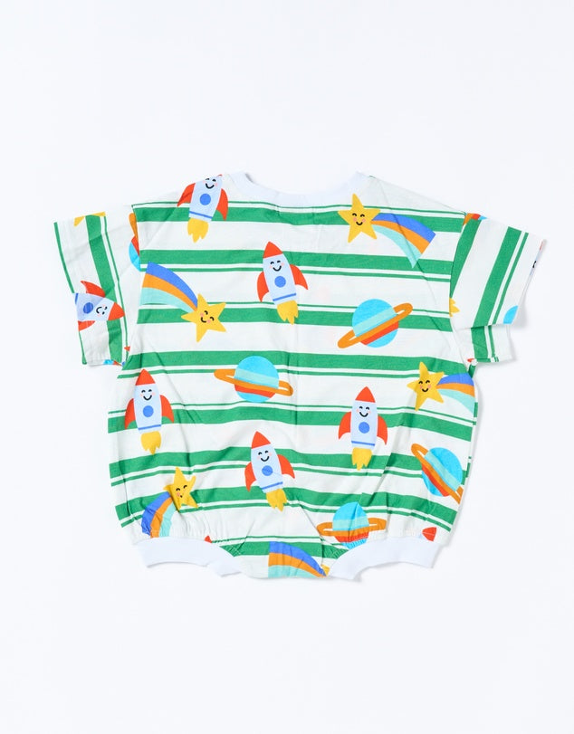 Blast off in comfort and colour with this out-of-this-world romper! Featuring smiling rockets, stars, and planets on green-striped cotton, this playful piece is perfect for tiny adventurers. Soft, stretchy, and snap-fastened for quick changes—because exploring the galaxy shouldn’t take forever.